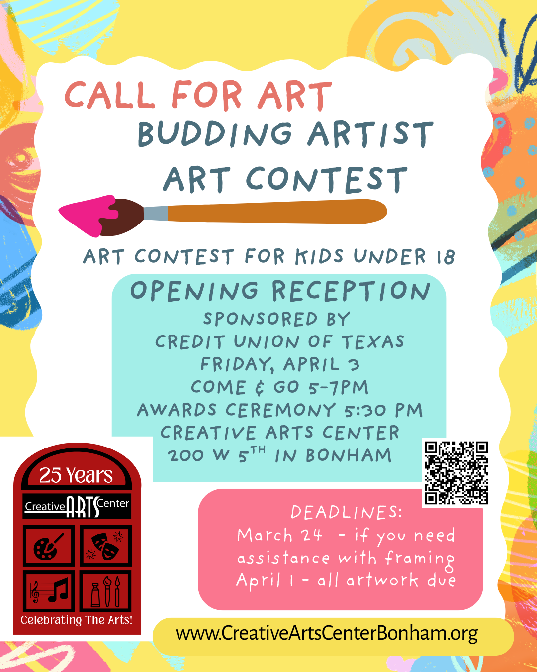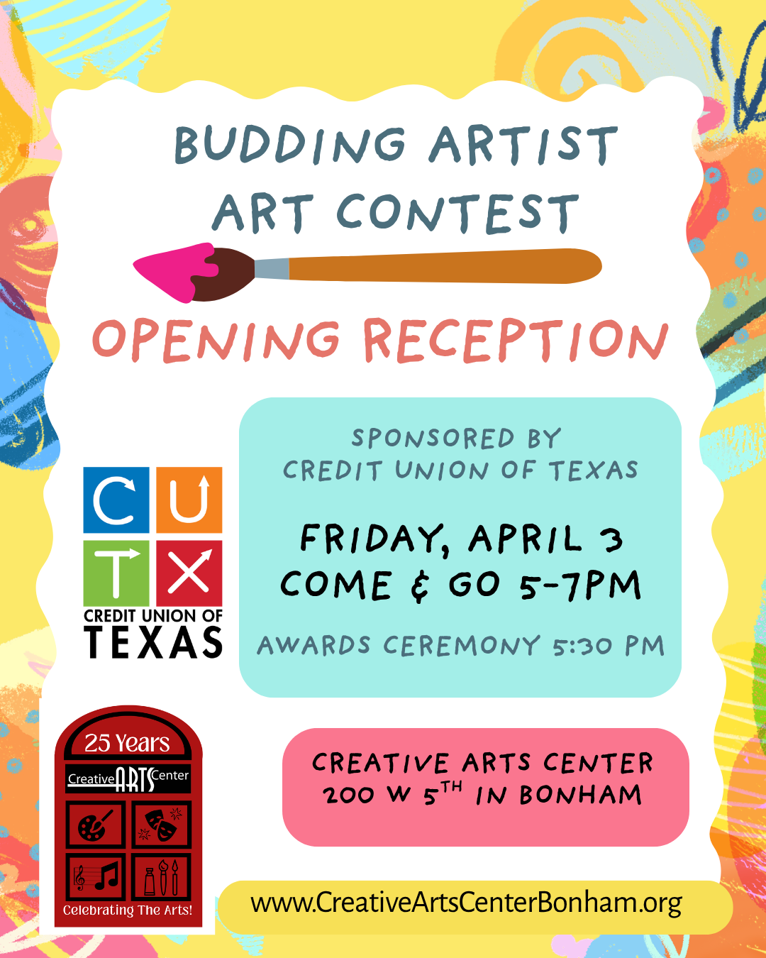 Contact the Creative Arts Center at 903-640-2196 or email Admin@CreativeArtsCenterBonham.org for more information!